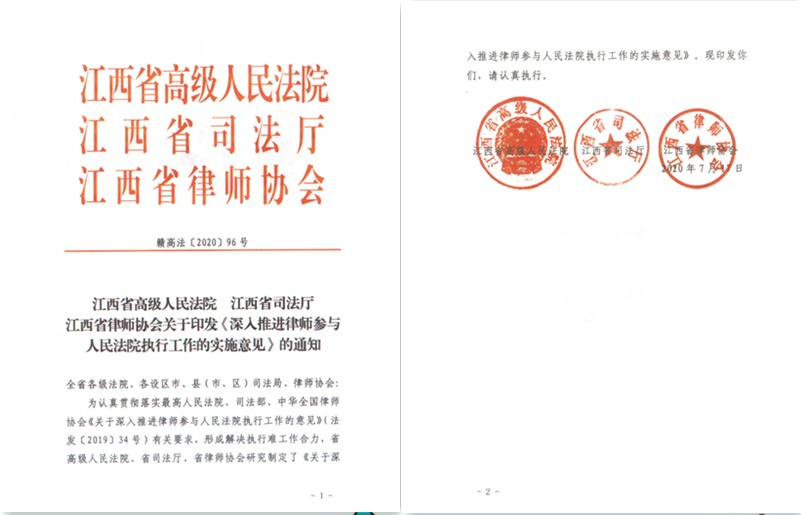 为深入贯彻落实最高人民法院、司法部、中华全国律师协会《关于深入推进律师参与人民法院执行工作的意见》(法发〔2019〕34号),形成解决执行难合力,江西省高级人民法院、省司法厅、省律师协会联合印发《关于深入推进律师参与人民法院执行工作的实施意见》(以下简称《意见》),从3个方面提出17条举措,就深入推进律师参与执行作出全面规定。